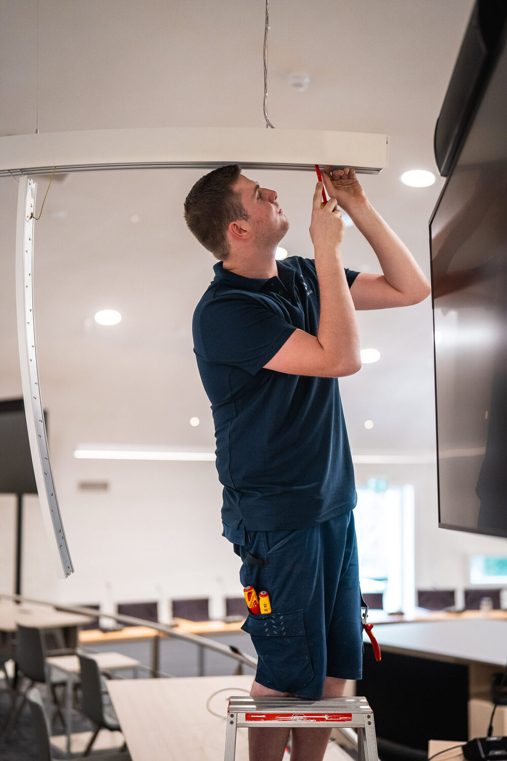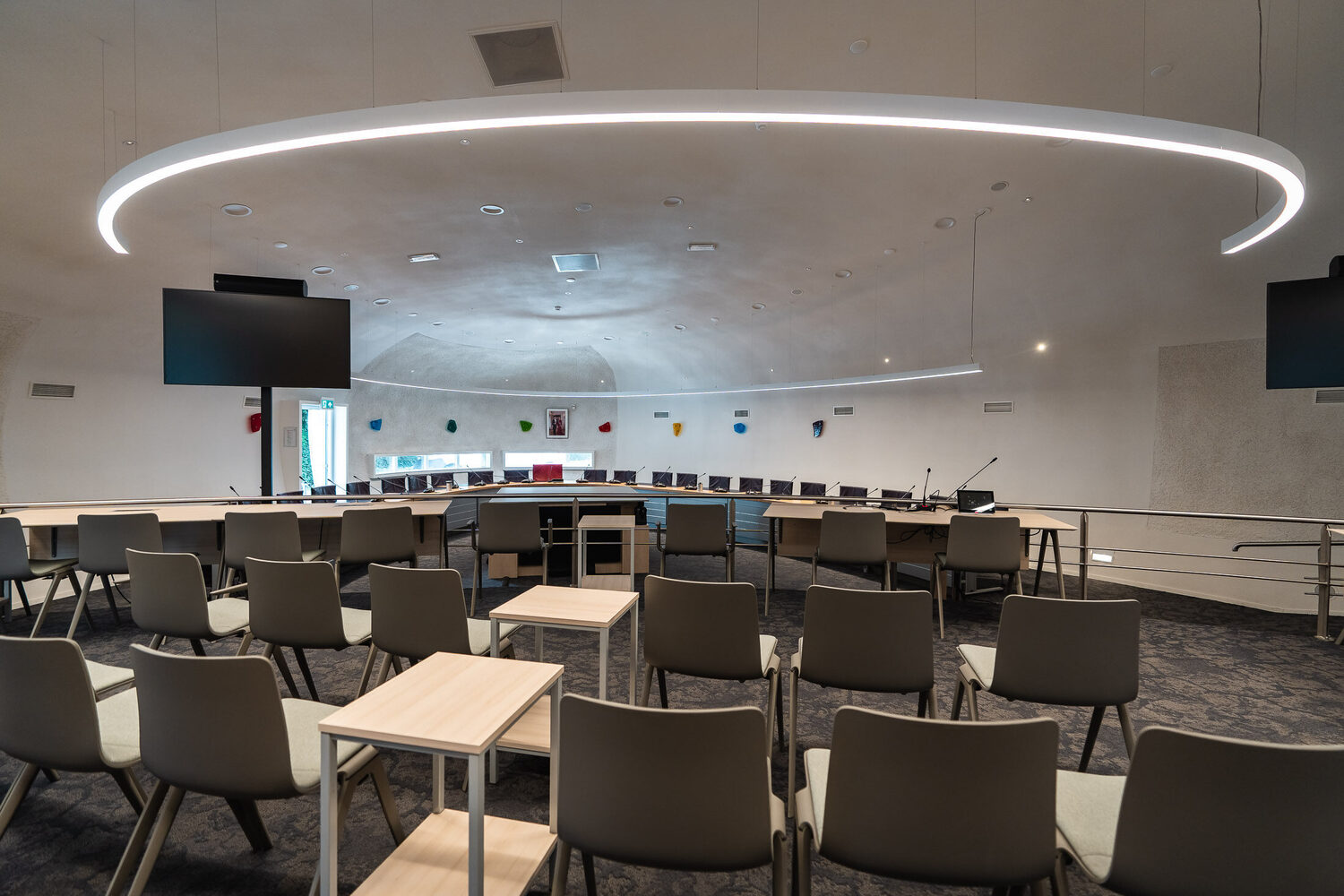 Onlangs hebben wij met trots drie maatwerk armaturen geleverd en gemonteerd in de raadzaal van de Gemeente Dongen. Een bijzonder project, aangezien de installatie plaatsvond in een coconvormige ruimte die vroeg om een creatieve en technische aanpak. In nauwe samenwerking met onze partner Pro-Light hebben wij een oplossing gerealiseerd die niet alleen perfect aansluit bij de architectuur van de zaal, maar ook zorgt voor optimale functionaliteit. De nieuwe verlichting is volledig DALI-dimbaar, waardoor sfeer en lichtbeleving flexibel afgestemd kunnen worden op iedere situatie. Het eindresultaat: een unieke combinatie van esthetiek, techniek en functionaliteit – en bovenal een tevreden opdrachtgever.
